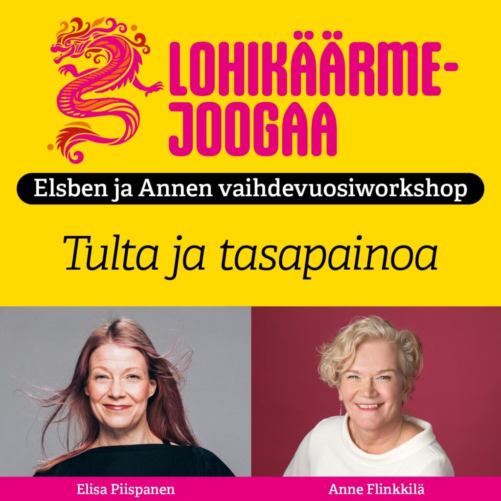 Kiusaavatko kuumat aallot, ärsyttääkö kanssaihmiset, tuleeko nukuttua huonosti? Kehittelimme näyttelijä, joogaopettaja Elisa Piispasen kanssa erityisesti vaihdevuosien pyörteissä eläville naisille työpajan, jossa voi rauhassa koetella omia rajojaan, heitellä mielen kuonat kuvitteelliseen nuotioon, pistää piirteet paikalleen kasvojoogan avulla ja lopuksi pysähtyä ja nauttia yin-joogan ja äänimaljojen syleilystä.